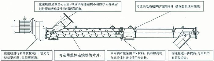 性能特点一高效率的输送:小直径、高转速、变螺距的螺旋体设计,确保产品在工作过程中顺畅、快速、均匀上料。一随意的布置:输送机的外壳采用优质无缝钢管通过法兰名段连接为整体,故整体刚性好,无论是水平,还是大倾角均可连续输送,并可直接与其配套的设备连接固定,无需地基基础,充分利用空间,移动、拆装十分方便。一良好的润滑:本公司专有PTM材料少油润滑滑动瓦加多层迷宫式油封设计以及由油泵,分配器,管路形成的集中润滑系统,使整机各运动付得到充分润滑,从而延长了整机的使用寿命。双重保护,自然更胜一筹。一可靠的密封:润滑密封可靠无渗漏,既无浪费物料,又创造了良好的工作环境,经改良的窥视孔装置无渗水和物料泄漏之忧。历经风雨侵袭却连续工作,且少有故障发生。一多元化的联接:进、出料口可采用万向节、布袋、法兰联接方式。