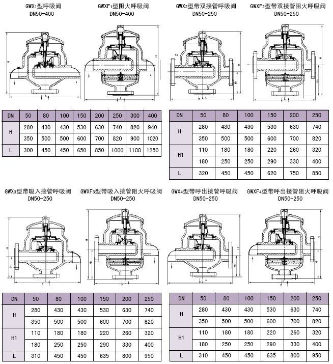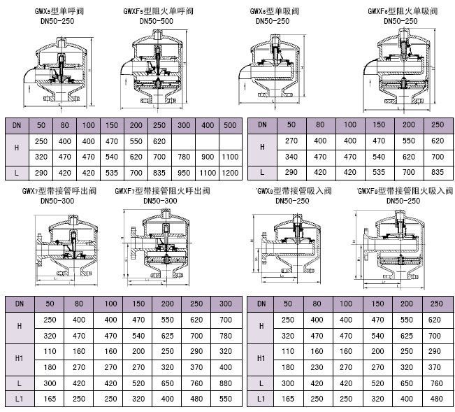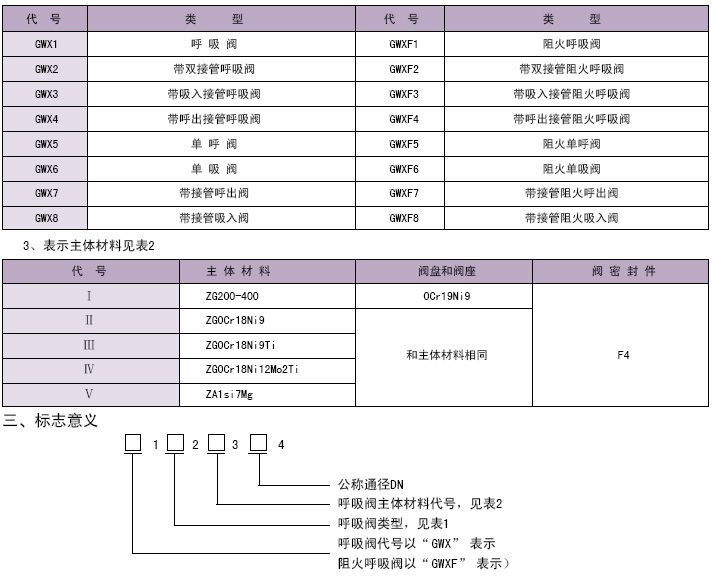1、呼吸阀代号以VGWX表示,VGWXF为阻火呼吸阀代号。